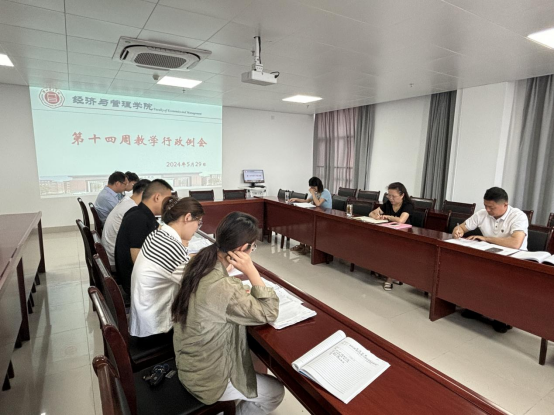2024年5月29日,经济管理学院在新行政楼725召开第十四周教学行政例会,会议由院长吴玲主持,副院长秦品德、院长助理张珊、实训中心主任及各教研室主任参加会议。