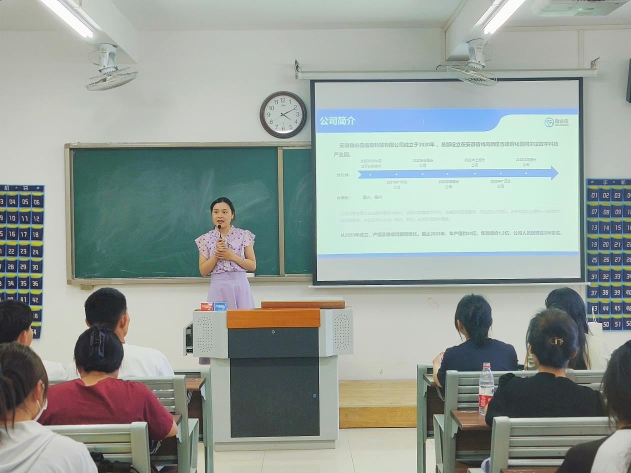 作为一家专注于信息技术研发与应用的企业,安徽微必应信息科技有限公司对经济管理专业学生的综合素质和创新精神给予了高度评价。公司人事代表孙经理在宣讲会上分享了公司的创新成果和未来发展规划,并表达了对优秀人才的渴望。公司承诺,将为毕业生提供全面的技术培训和项目实践机会,助力他们在自身职业发展的道路上不断前行。