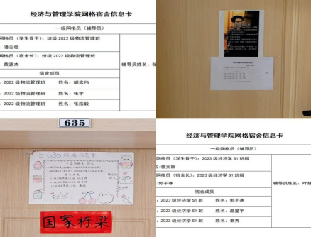辅导员二进学生宿舍,形成具体举措解决学生问题,提供心理支持和疏导。各辅导员按就近、便捷、高效的原则完成了我院400余间学生宿舍的网格划分,除毕业班外的1600余名同学积极参与其中,并在每个网格单元设立二、三级网格员,张贴网格宿舍信息卡,形成“自我管理、自我服务、自我监督”的良好氛围。