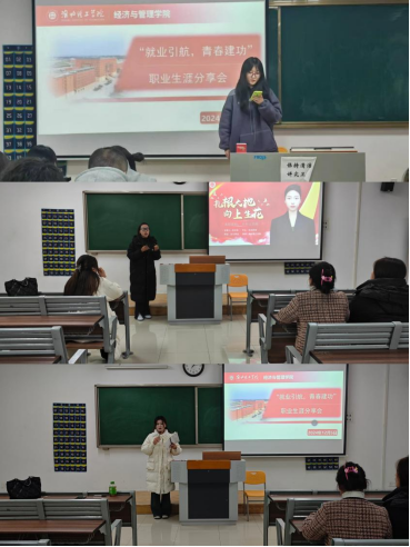 由范红玲、韩亚群和袁怡玟作为成长赛道的获奖选手为同学们分享经验。第十八届大学生职业生涯规划大赛校级比赛成长赛道一等奖范红玲同学在分享会中提到,自己的职业生涯规划要符合时代价值,树立正确向上的职业追求,并且要充分考虑自己的专业、能力、兴趣等种种要素。要勇于尝试,敢于挑战!