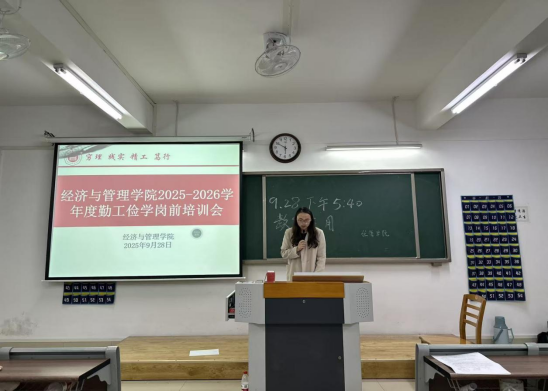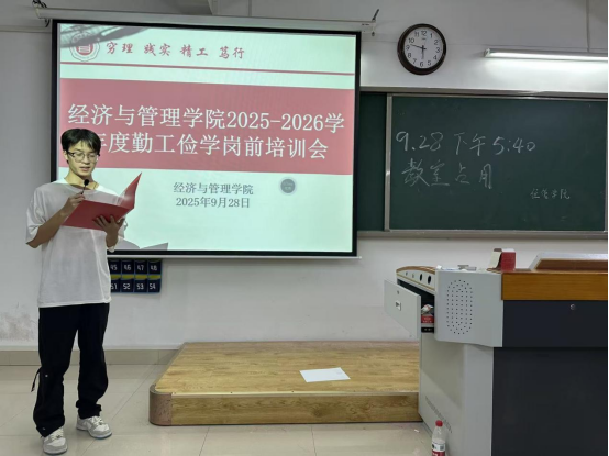 为规范勤工助学岗位管理,帮助学生更好地适应工作角色,beat365英国官网网站于9月28日在二教422召开2025-2026学年勤工助学岗前培训会,学院书记助理员禹辛、实验室主任、教学秘书李健、负责勤工助学工作的老师以及66名已录用学生共同参加,会议由院学生会文体部部长汪朱仝主持。