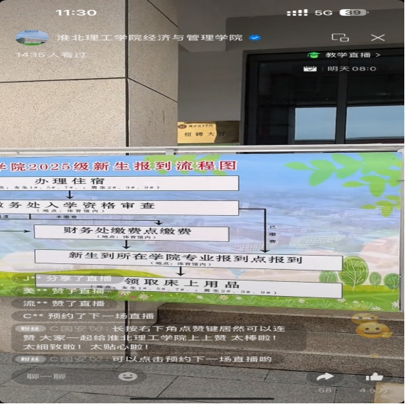 迎新直播期间,主播团队通过镜头带领新生“云逛校园”,详细介绍了教学楼、图书馆、食堂、宿舍等重点区域的分布及功能特点;针对新生报到的身份核验、材料提交、校园卡激活等关键环节进行演示,并实时回应弹幕区提出的各类疑问。图文直播板块则同步推送迎新图片,无论是志愿者热情引导的身影、新生与家长满脸的期待,还是校园里醒目的迎新指引,都一一呈现,让“云迎新”更具画面感。据统计,图文直播截止9月7日下午5点30分,上传照片近4000张,总浏览量超过37万人次;举办迎新直播八场,进入直播间人数总计14202人,直播间点赞次数总计31.1万次。