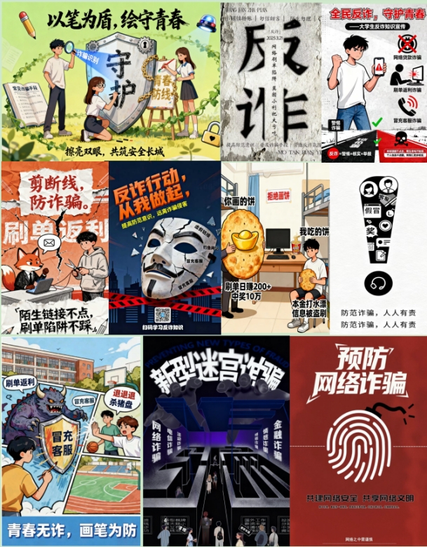 本次活动以“以创促学、以讲传防” 为核心目标,既是对校园安全专项整治工作要求的积极响应,更是学院深化 “安全育人”“实践育人” 理念的创新举措。活动一经推出便得到全院学子的热烈响应,共吸引 300 余名在校学生踊跃参与,成为集反诈知识学习与创意实践于一体的特色育人课堂。同学们积极践行 “理论学习 +AI创意转化” 的实践思路,全身心投入反诈海报的创作与宣传筹备工作中,用青春创意为校园反诈注入鲜活力量。