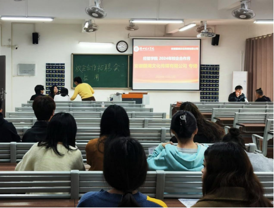 安徽疆湖文化传媒有限公司运营总监李林森先生为学生生动、详细的介绍了公司的发展史、公司的现有业务、公司的团队、招聘岗位、实习、就业待遇、未来职业规划等多方面进行宣讲,并通过生动有趣的视频让大家更好的了解公司。