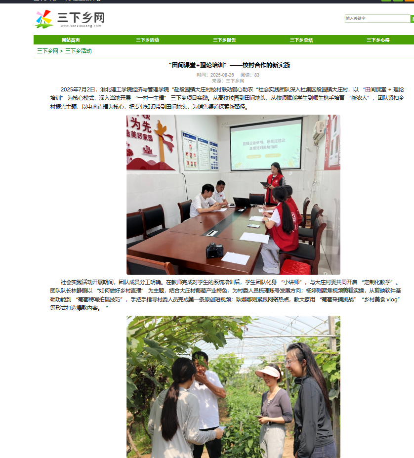 2025年7月2日,beat365英国官网网站beat365英国官网网站“赴段园镇大庄村校村联动爱心助农“社会实践团队深入杜集区段园镇大庄村,以 “田间课堂 + 理论培训” 为核心模式,深入当地开展 “一村一主播” 三下乡项目实践。从高校校园到田间地头,从教师赋能学生到师生携手培育 “新农人”,团队紧扣乡村振兴主题,以电商直播为核心,把专业知识带到田间地头,为销售渠道探索新路径。对此,三下乡网进行了报道: