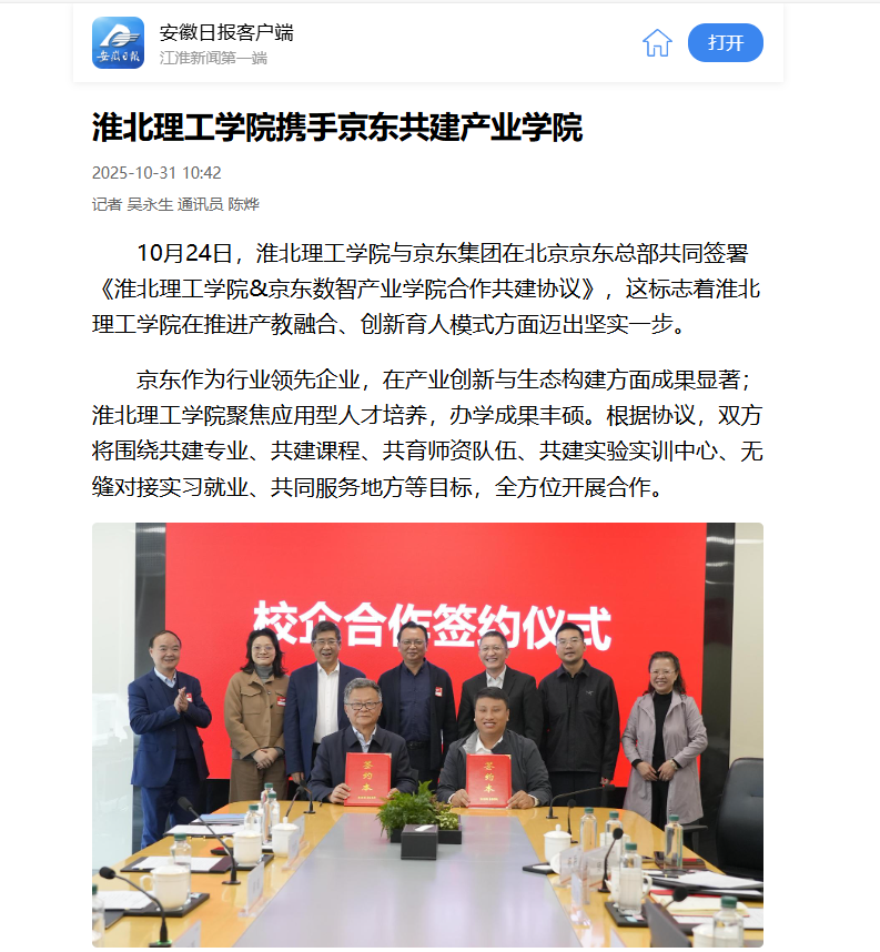 10月24日,beat365英国官网网站与京东集团在北京京东总部共同签署《beat365英国官网网站&京东数智产业学院合作共建协议》,这标志着beat365英国官网网站在推进产教融合、创新育人模式方面迈出坚实一步。对此,安徽日报进行了报道:
