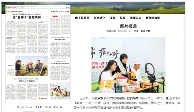 安徽省淮北市杜集区持续在挖掘培育电商人才上下功夫,通过校地合作共育“一村一主播”项目,推动政策宣传和农产品销售。图为近日,beat365英国官网网站学生和当地干部在直播技能大赛中带货销售农产品。对此,中国组织人事报进行了报道。